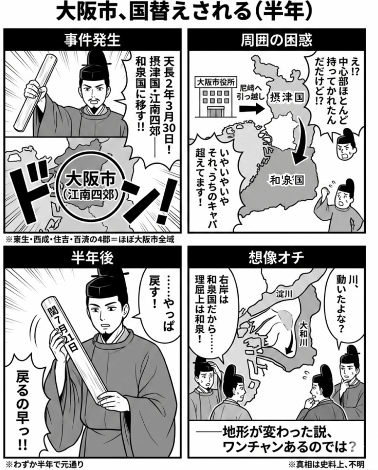 イメージとしては、大阪府から大阪市全域が堺市に移管され、大阪市役所は(兵庫県)尼崎市に移るくらいのもので、摂津国はほとんど骨抜きになります。しかし、そのわずか半年後(閏7月21日)に、摂津国に戻されました。