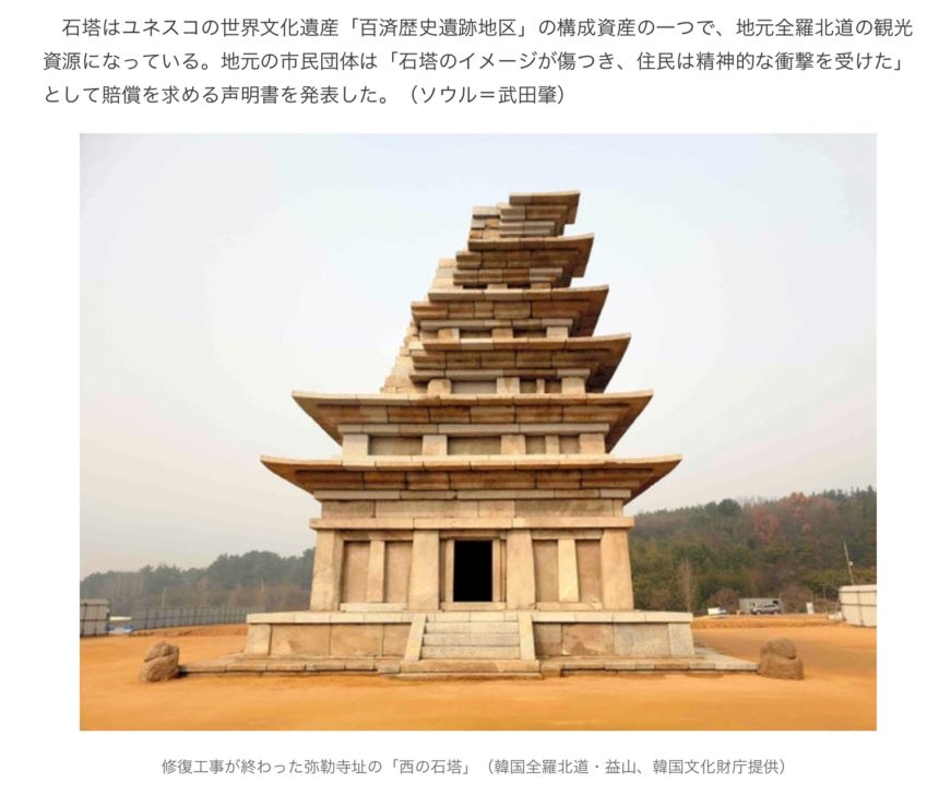 韓国で国宝の石塔を20年かけて修復、一部を復元したところ、なんか違うと住民が怒っているそうです。朝日新聞の報道。