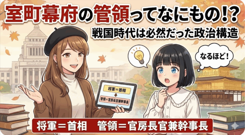 エミ: 「ご名答! 将軍の補佐役(官房長官)としての行政権限と、派閥をまとめるボス(幹事長)としての政治力。 この二つの最強権限を一手に握っていたのが『管領』なのよ」