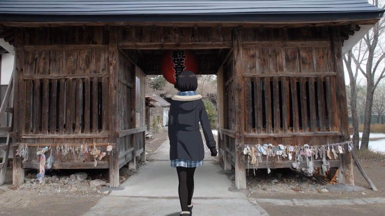 (旧越後街道沿いの駐車場に車を停めた二人。吐く息が白い。サキがマフラーに顔を埋めながら、観音堂のほうをじっと見ている)