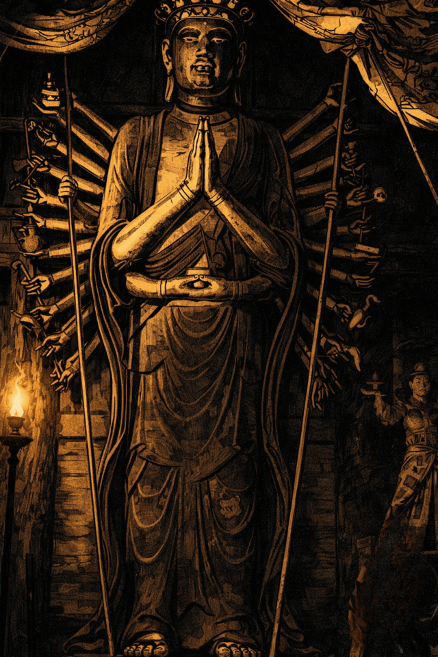 (サキが千手観音を見上げたまま動かない。薄暗い堂内で、無数の腕が影を落としている)