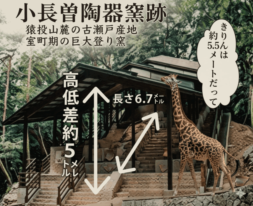発掘のデータによると、窯の長さは6.7メートル。作業をする前庭から窯の上までの高低差は5メートルもあります。地上で最も高い動物キリンの高さが5・5メートルというから すごい規模の「工場」だったんですね!