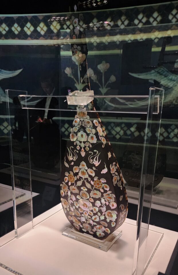 エミ: そして見てよこれ!今回の展示のもう一つの主役「再現模造」たち!これは正倉院宝物を代表する「螺鈿紫檀五絃琵琶(らでんしたんのごげんびわ)」。