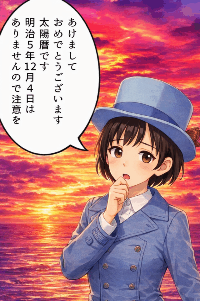 明治6年(1873年)1月1日、太陽暦を施行。明治5年12月3日を明治6年1月1日とする。