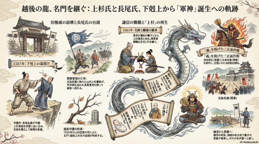 【人物相関図】長尾景虎が上杉謙信に変わるまで ※( )内は役職など。主要な人物・流れを抜粋しています。 凡例 上杉氏(宗家) 上杉氏(越後分家) 長尾氏(守護代) 上杉謙信(継承後) ■ 上杉氏の祖 足利氏との姻戚関係を持つ 上杉重房 足利頼氏の妻 頼重 足利尊氏・直義の母 清子 (数代略) 憲房 山内上杉氏の祖・関東管領 / 越後守護 憲顕 【関東管領:山内上杉氏(宗家)】 憲方 (数代略) 憲房 最後の関東管領 憲政 北条氏康に敗れ越後へ亡命 → 家督と管領職を景虎(謙信)へ譲る 【越後守護:越後上杉氏(分家)】 憲栄 (宗家・憲方の子) 房方 (数代略) 長尾為景に討たれる 房能 (養子) 最後の越後守護。1550年没・断絶 定実 ▼ 上杉氏の家臣・守護代 ■ 長尾氏(上杉氏の家臣・守護代) 関東長尾氏の祖・上杉憲顕のもとで守護代として活躍 長尾景忠 【越後守護代:越後長尾氏】 上杉憲顕から越後守護代に任じられる 高景 (数代略) 能景 下剋上で越後守護・上杉房能を討つ 為景 長男・当主 晴景 末子 / のちの上杉謙信 景虎(上杉謙信) ※定実の死後、越後国主となる ※憲政の養子となり上杉宗家を継ぐ 家督・関東管領職を景虎へ譲渡 定実没後、景虎が越後国主へ